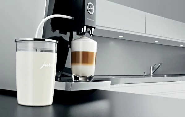 The package includes a 0.5 l glass container, a lid made of chrome and silicone, a milk tube made of stainless steel and a silicone tube.